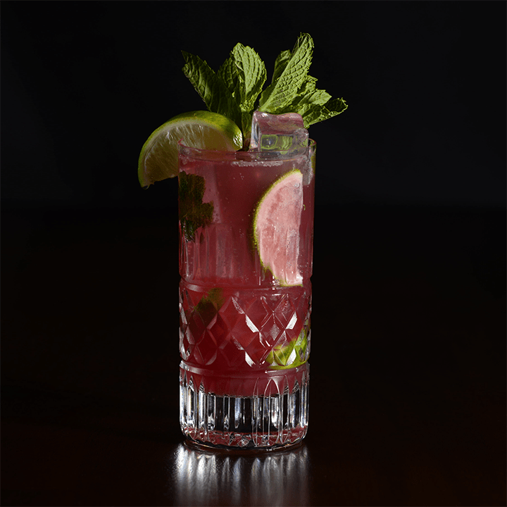 Add WMS Hibiscus Liqueur to tin along with 3 lime wedges and 6-8 mint leaves. Muddle, then add white rum and simple syrup. Shake lightly with ice to incorporate and dump into a Collins glass. Top with soda water. Garnish with lime wedge and mint.